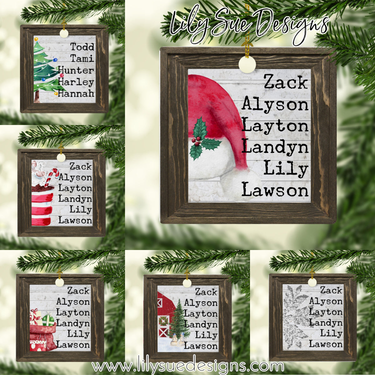 Christmas Ornament. Please leave names in customization box. Triple check spelling I will print as is. Custom ornament adds charm to your Christmas Tree. Perfect for use as gift tags or stocking stuffers. Faux Frame on ornament.