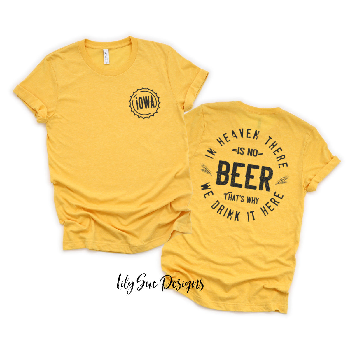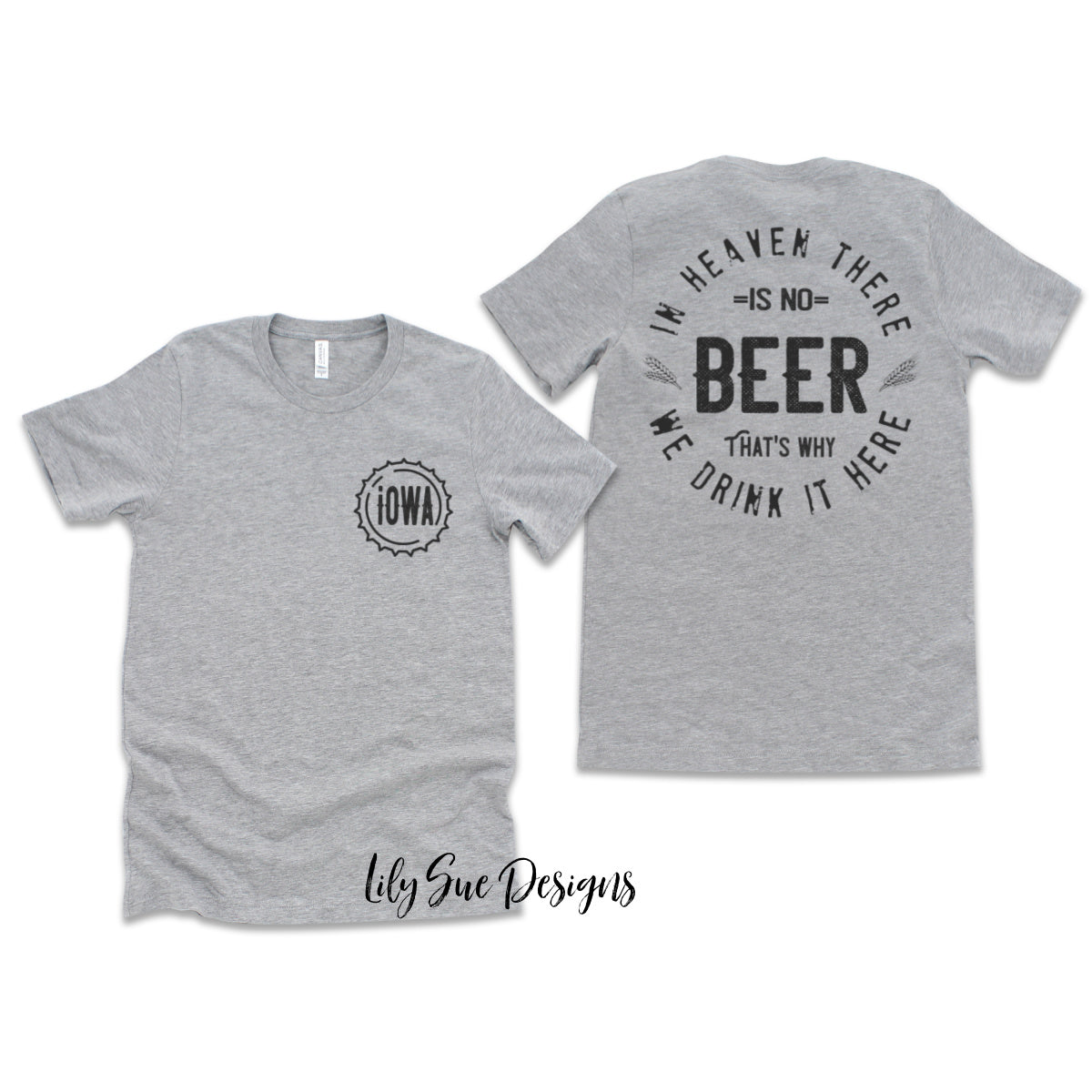 Bottle cap Iowa on the front of shirt. In Heaven there is no beer on the back of shirt. Design is printed on our Bella Canvas unisex tee. Fits true to size. size chart included. Our design is screen printed