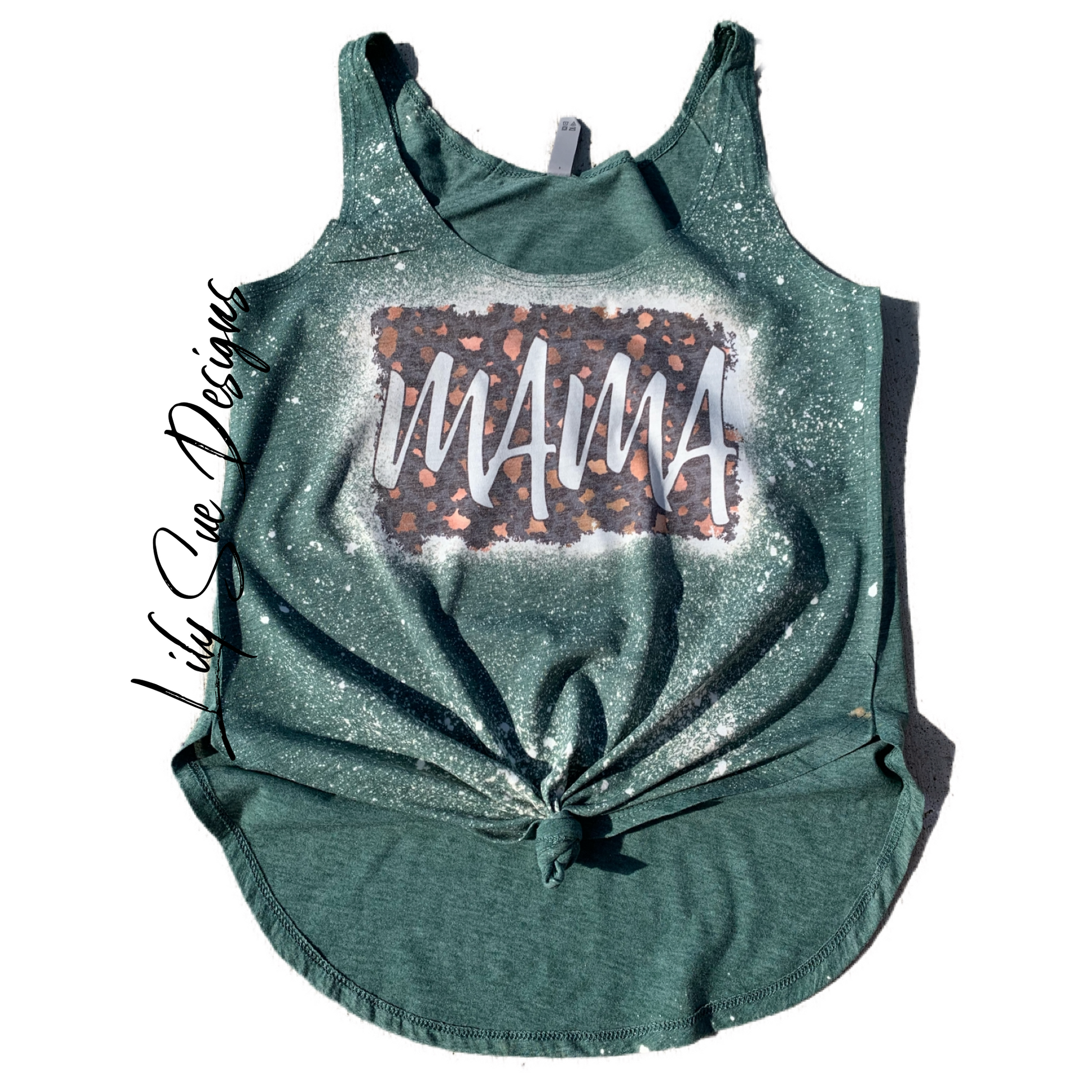 Our tanks are bleached and leopard MAMA added in our sublimation ink. Each bleach tee is unique. Colors of bleach vary.